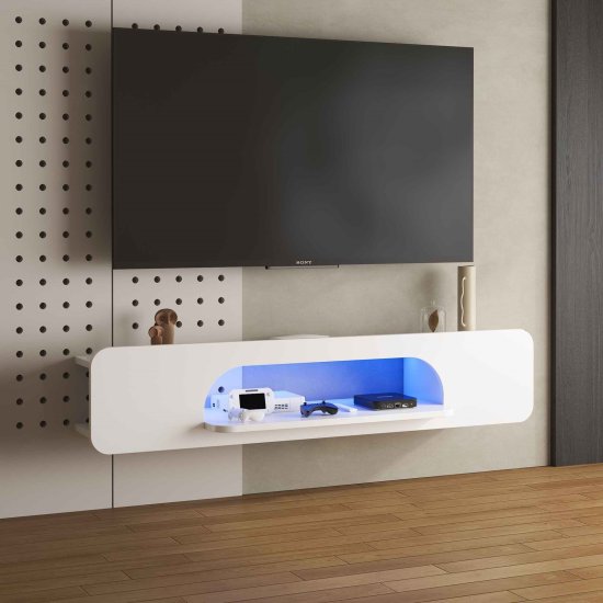 מזנון טלוויזיה צף מעוצב ברוחב 146 ס"מ הנתלה לקיר ומצויד בתאורת LED אינטגרלית ליצירת אווירה מיוחדת. המזנון מגיע בשני גוונים – לבן נקי או שחור אלגנטי – וכולל שני תאים סגורים עם דלתות ושני מדפים פתוחים, כשכל העיצוב שלו מכוון ליצירת מראה מרחף מודרני ומינימליסטי
