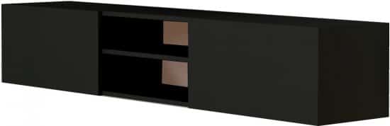 מזנון צף תלוי ברוחב 180 ס"מ בגוון שחור מט אלגנטי, בעל חלל אמצעי פתוח ושתי קלאפות (דלתות יורדות) נפתחות לחללי אחסון סגורים. המזנון מעוצב בקווים נקיים ומינימליסטיים, כולל מעבר כבלים מוסתר בחלקו האחורי, ומגיע עם כל הפרזול הדרוש לתלייה בטוחה על הקיר